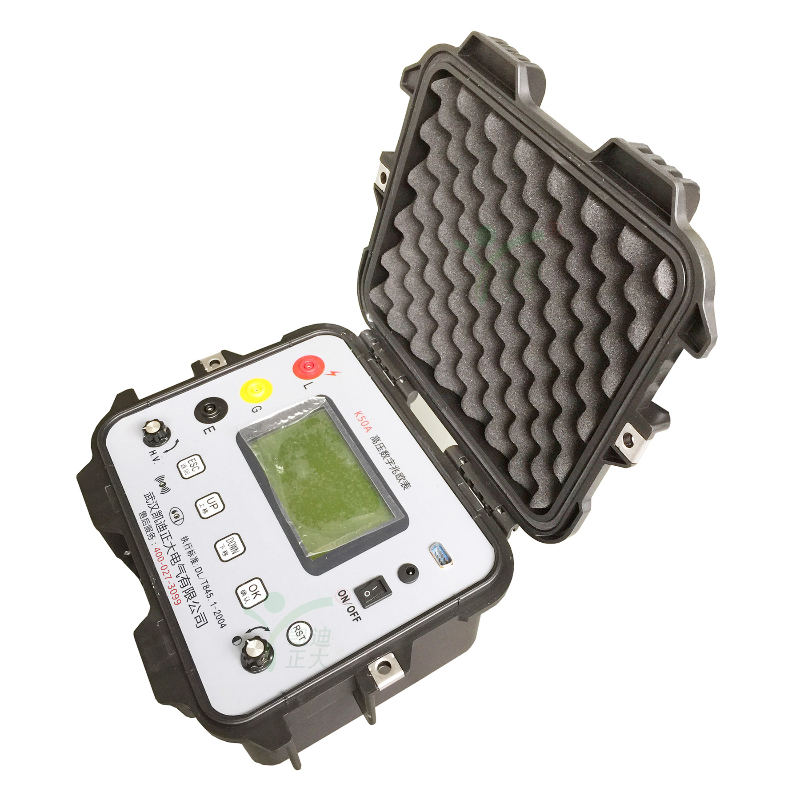 KD50A高壓絕緣電阻測試儀具有50V、100V、250 V、500V、1.0kV、2.5kV、5.0kV、10.0kV共8個電壓輸出檔,測試最大可達10TΩ。容量大、抗干擾強、液晶屏同步顯示、交直流兩用、操作簡單、自動計算各種絕緣指標、吸收比、極化指數、各種測量結果具有防掉電功能等特點。是測量大容量變壓器、互感器、發電機、高壓電動機、電力電容、電力電纜、避雷器等絕緣電阻的測試儀器。