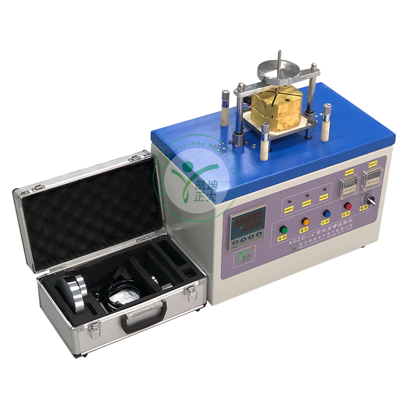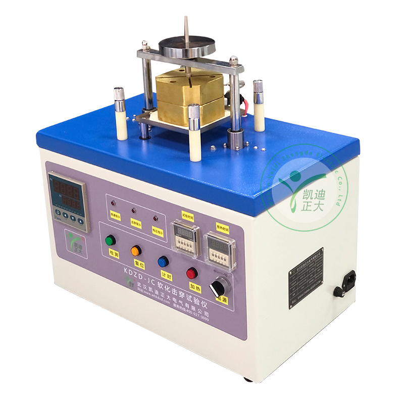 KDZD-JC軟化擊穿試驗(yàn)儀用于檢測(cè)3.00mm及以下漆包線在熱狀態(tài)下漆膜軟化后的絕緣性能,根據(jù)設(shè)定的預(yù)熱溫度、試驗(yàn)時(shí)間、儀器自動(dòng)完成對(duì)試樣的預(yù)加熱、加負(fù)荷、加試驗(yàn)電壓,達(dá)到試驗(yàn)時(shí)間或試樣被擊穿時(shí)即卸負(fù)荷,發(fā)出聲光信號(hào)。該儀器采用熱電偶測(cè)溫,智能溫度控制,能自動(dòng)調(diào)節(jié)和顯示試驗(yàn)溫度、測(cè)試部分采用集成電路,整個(gè)測(cè)試過程自動(dòng)完成。