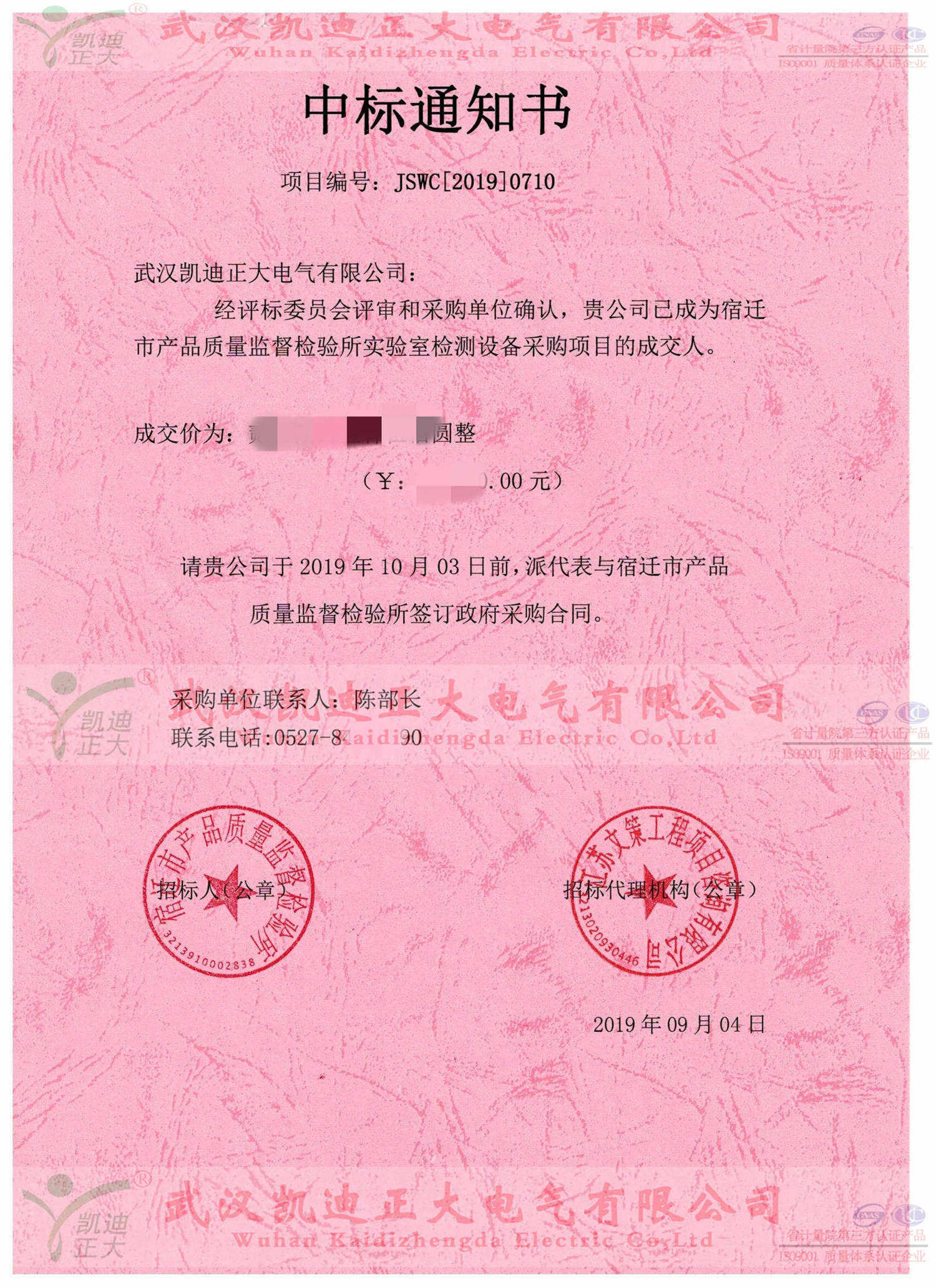 2019年9月份,受邀參與隸屬于宿遷市質(zhì)量技術(shù)監(jiān)督局的宿遷市產(chǎn)品質(zhì)量監(jiān)督檢驗(yàn)所實(shí)驗(yàn)室檢測(cè)設(shè)備采購(gòu)項(xiàng)目,并以最高分獲得中標(biāo)人。因武漢疫情等影響昨日收到宿遷質(zhì)檢所的中標(biāo)通知書(shū)。