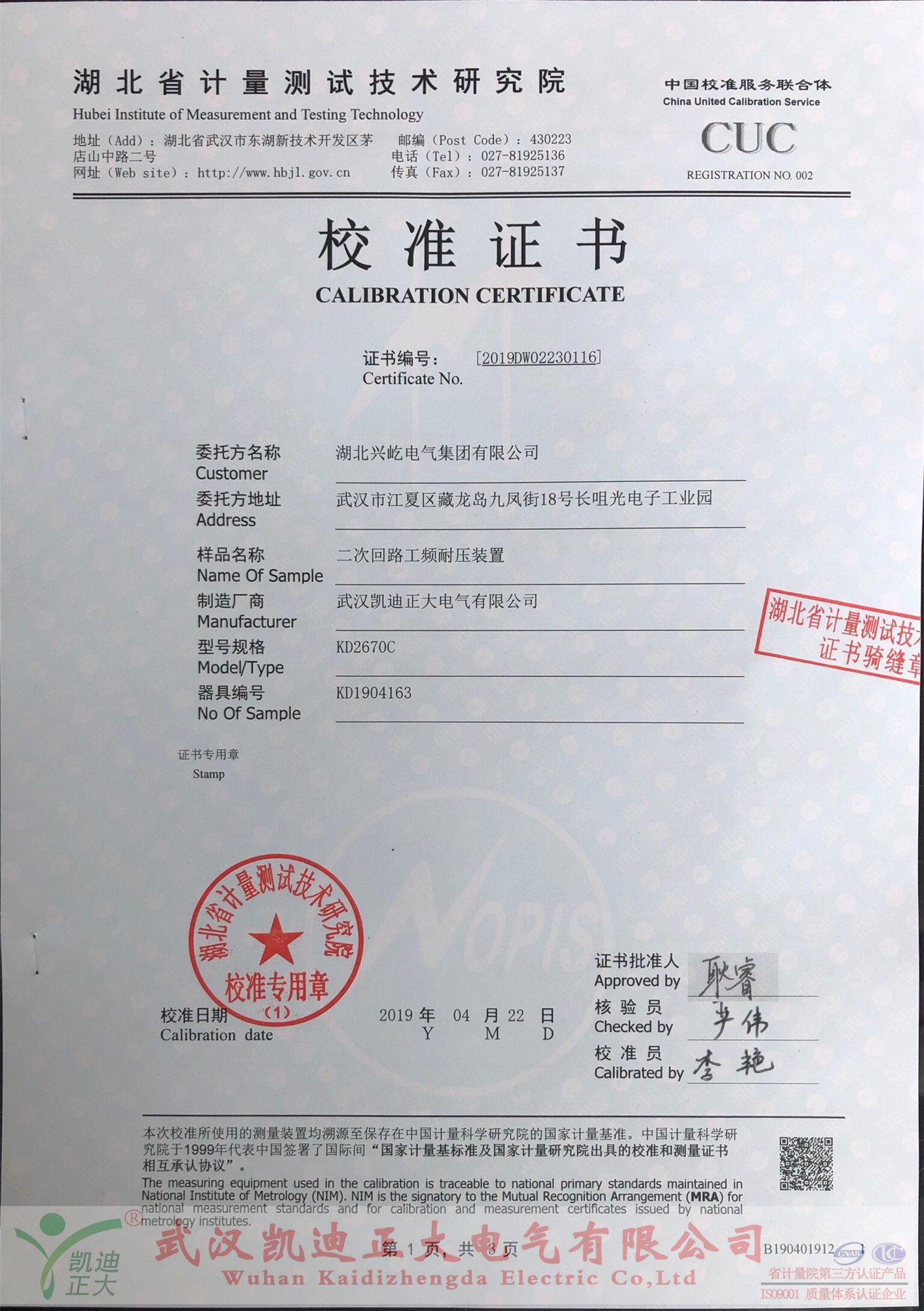 購買后便送往中國校準服務聯合體-湖北省計量測試技術研究院檢定,由省計量院出具的《校準證書》,證書編號:2019DW02230116,校準員:李艷,檢驗員:嚴偉,證書批準人:耿睿。