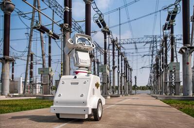 變電站中最高新的無軌智能巡檢機器人,有著擬人化的外形,頭部有眼睛、耳朵,軀體靠脖子與之連接,腳部為兩組大小不同的輪子。在高溫、大風、暴雨等各種惡劣天氣下,智能機器人能代替人力,在電網設備的運維中發揮重要作用。