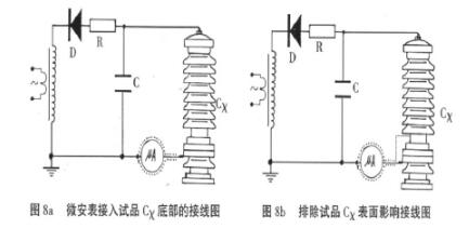 c.對氧化鋅、磁吹避雷器等試品接地端可拆開的情況下,也可采用在試品的底部(地電位側(cè))串入電流表進(jìn)行測量的方式。 當(dāng)要排除試品表面泄漏電流的影響,可用軟的裸銅線在試品地電位端繞上幾圈并與屏蔽線的屏蔽相聯(lián)接(見下圖)