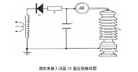 a.一般測量時,當(dāng)便攜式直流高壓發(fā)生器接好線后,先把聯(lián)接試品的線懸空,升到試驗(yàn)電壓后讀取空試時的電暈和雜散電流I,然后接上試品升到試驗(yàn)電壓讀取總電流Ⅰ1;試品泄漏電流:Io =Ⅰ1—I’ b.當(dāng)需要精確測量被試品泄漏電流時,則應(yīng)在高壓側(cè)串入高壓微安表(見下圖)