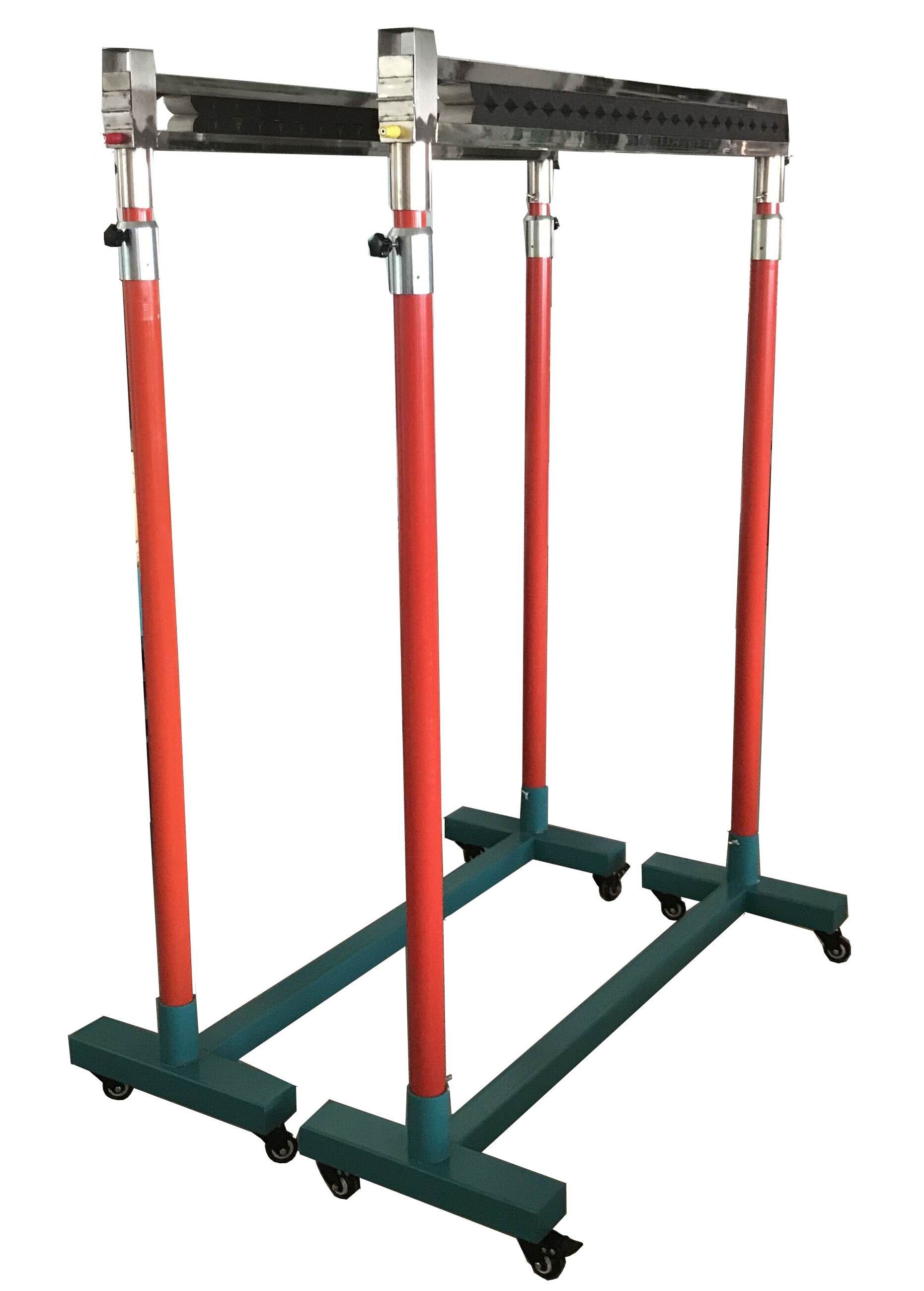 手動(dòng)升降支架采用分體式結(jié)構(gòu),可根據(jù)試品長(zhǎng)短的需求,調(diào)節(jié)支架的距離來(lái)滿足試驗(yàn)的要求,每個(gè)分體支架有大小2根絕緣管嵌套組成,第一節(jié)有效高度為1.2米,在電壓要求比較高時(shí),通過(guò)手動(dòng)拉升支架,調(diào)節(jié)支架的高度,在接頭處有安裝緊固旋鈕,當(dāng)支架升到合適的位置時(shí),旋轉(zhuǎn)固定旋鈕將第二節(jié)固定。
