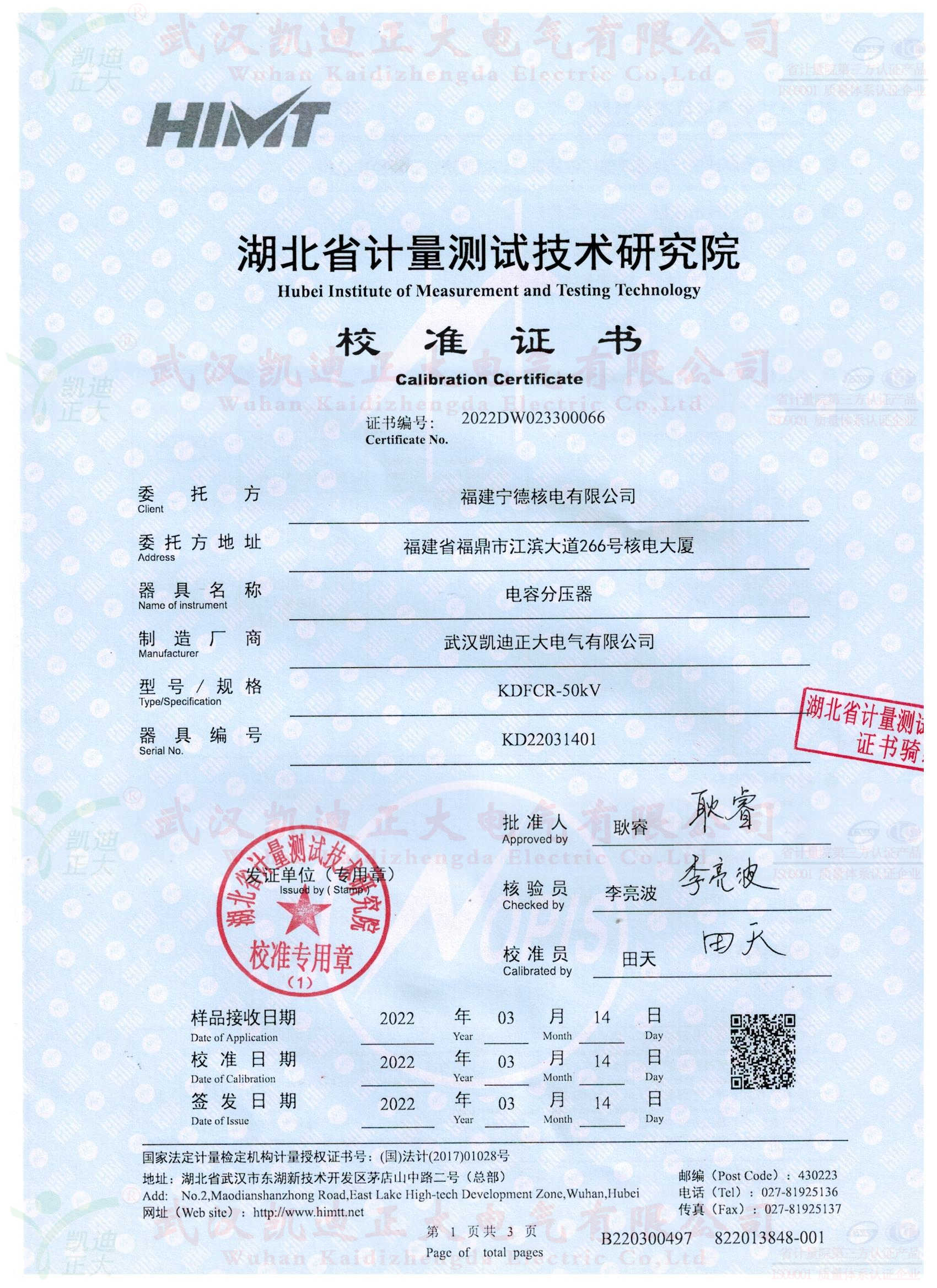 我司自成立以來多次獲得中廣核核電訂單,這次是福建寧德核電站采購KDFCR-50kV電容分壓器、KDQX-50kV保護球隙、50kV高壓試驗用電纜等設備一批。應要求供應設備需要獲得湖北省計量測試研究院的檢定合格證書。