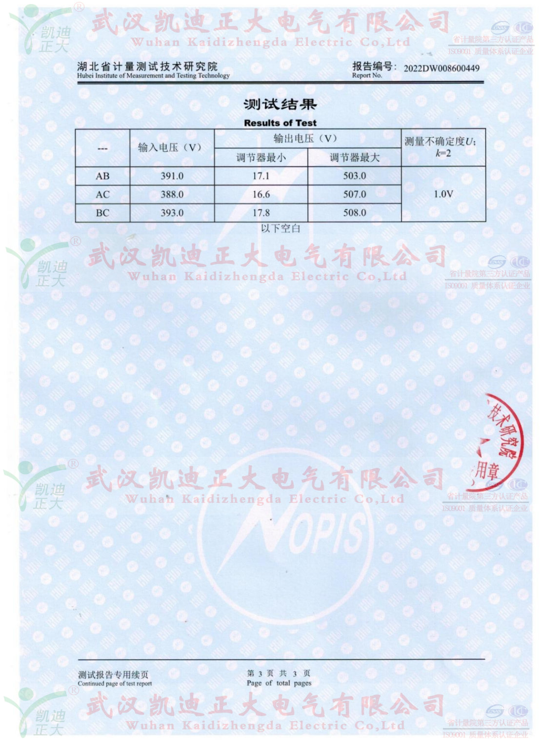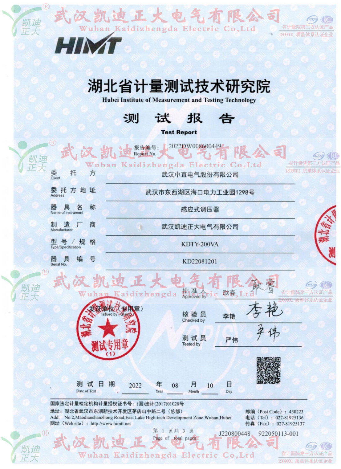 由于供應速度、售后服務態度因素很快就收到了長興電器集團中直電氣股份公司的采購訂單。感應調壓器送湖北省計量測試研究員測試的紙質報告已出。送檢結果如下:本次檢測是以數字多用表為主要檢測設備,以JJF 1587-2016《數字多用表校準規范》為技術依據,由湖北省計量測試技術研究院檢測完成的。