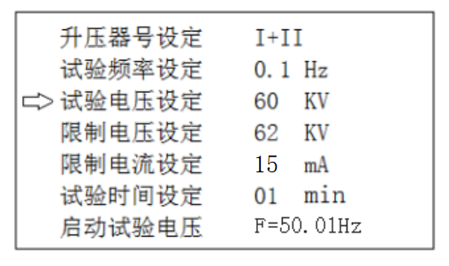 - 升壓器號設定:如果使用I號升壓器單獨升壓,升壓器號設定為I號(此時試驗電壓設定≤30KV),如果使用I號升壓器和II號升壓器串聯升壓,升壓器號設定為I+II號。