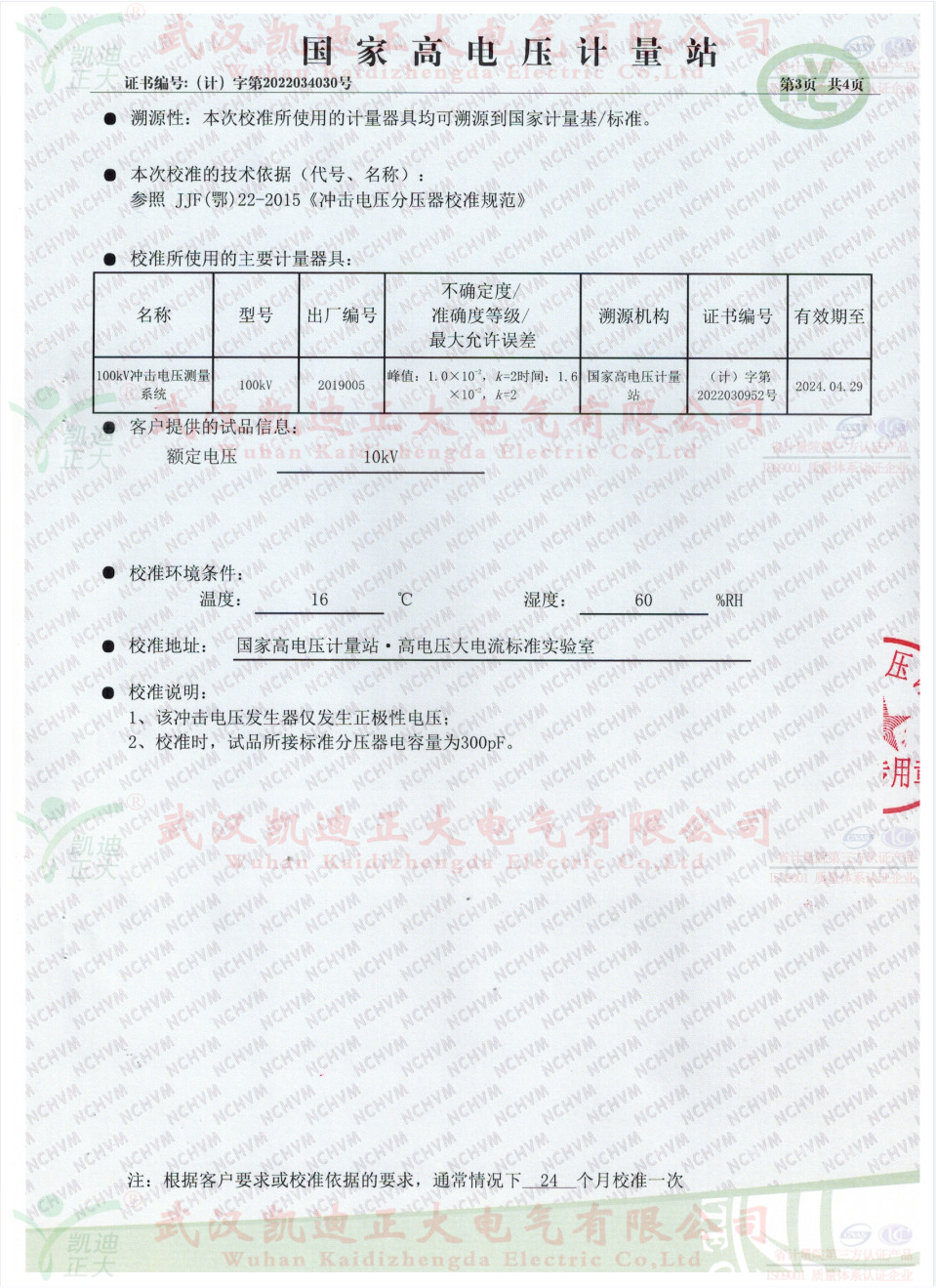 繼大連產品質量檢驗研究院采購低壓開關柜檢測設備KD7742智能耐壓絕緣測試儀獲大連計量檢驗檢測研究院有限公報告,宿遷產品質量技術研究院采購KDLJ-30雷電沖擊電壓發生裝置獲得國家高電壓計量站證書,這次成都計量院采購KDLJ-30雷電沖擊電壓發生裝置獲得國家高電壓計量站(武高所)校準證書。