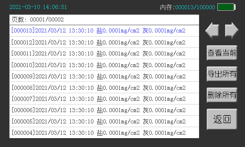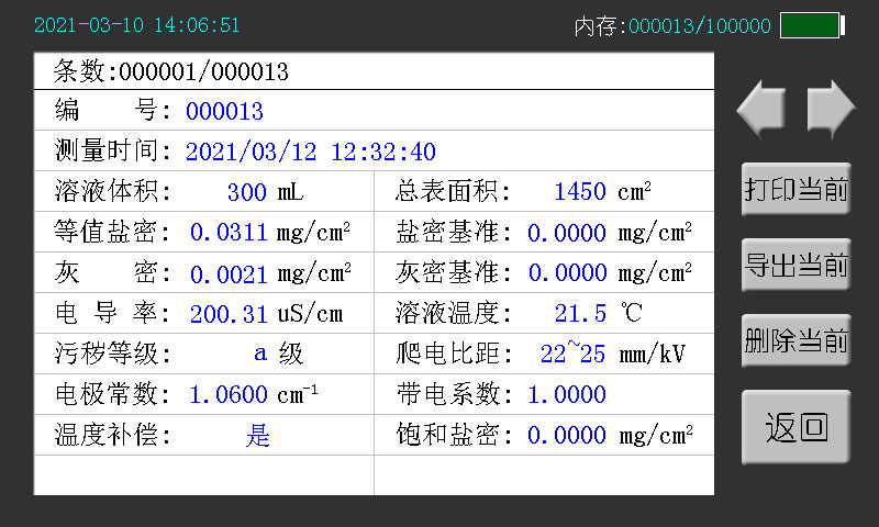 鹽密基準(zhǔn)值:在測(cè)量頁(yè)點(diǎn)“校準(zhǔn)”按鈕后會(huì)自動(dòng)保存溶液的初始鹽密值作為“鹽密基準(zhǔn)值”,也可以用戶自定義。
