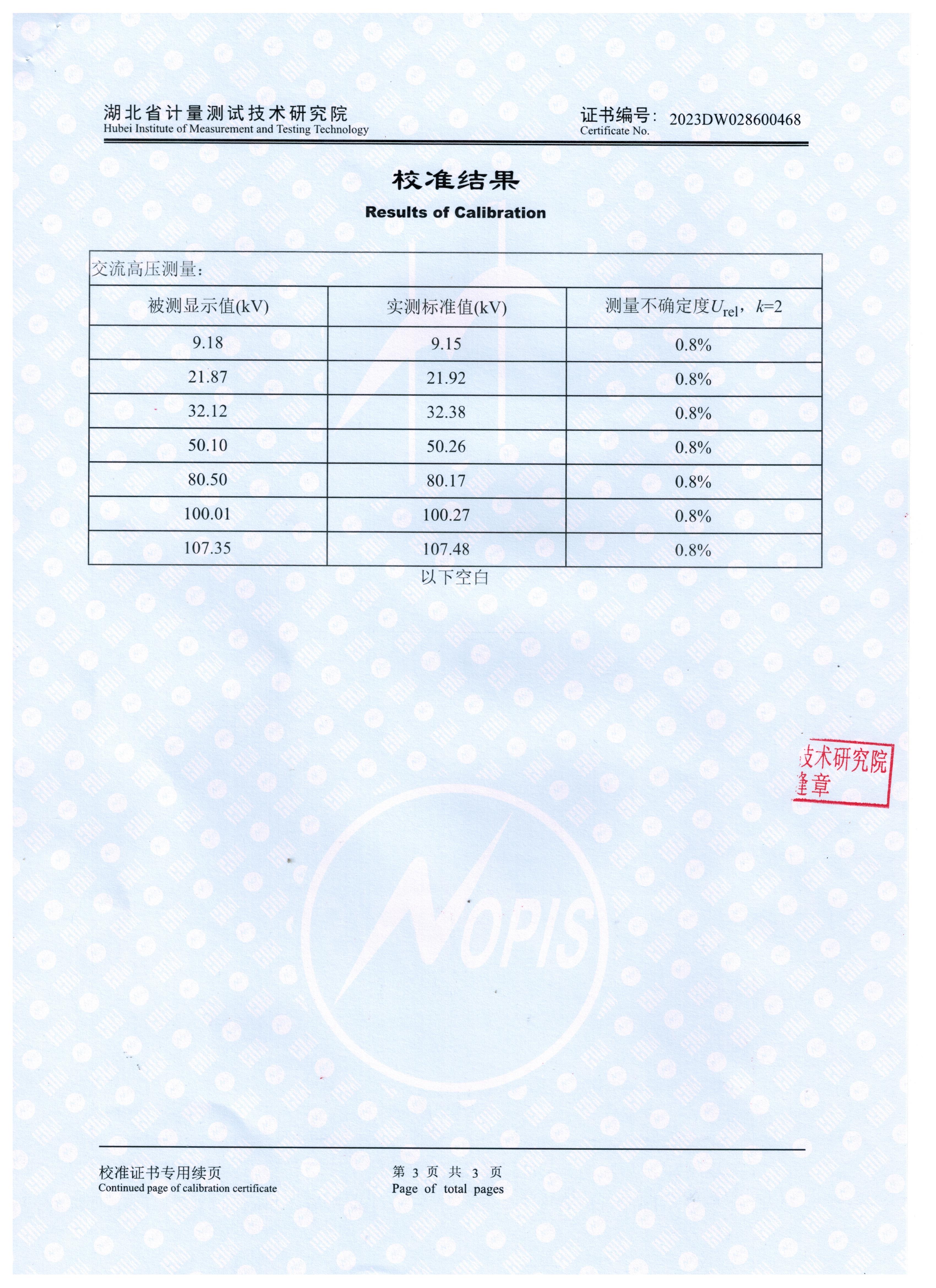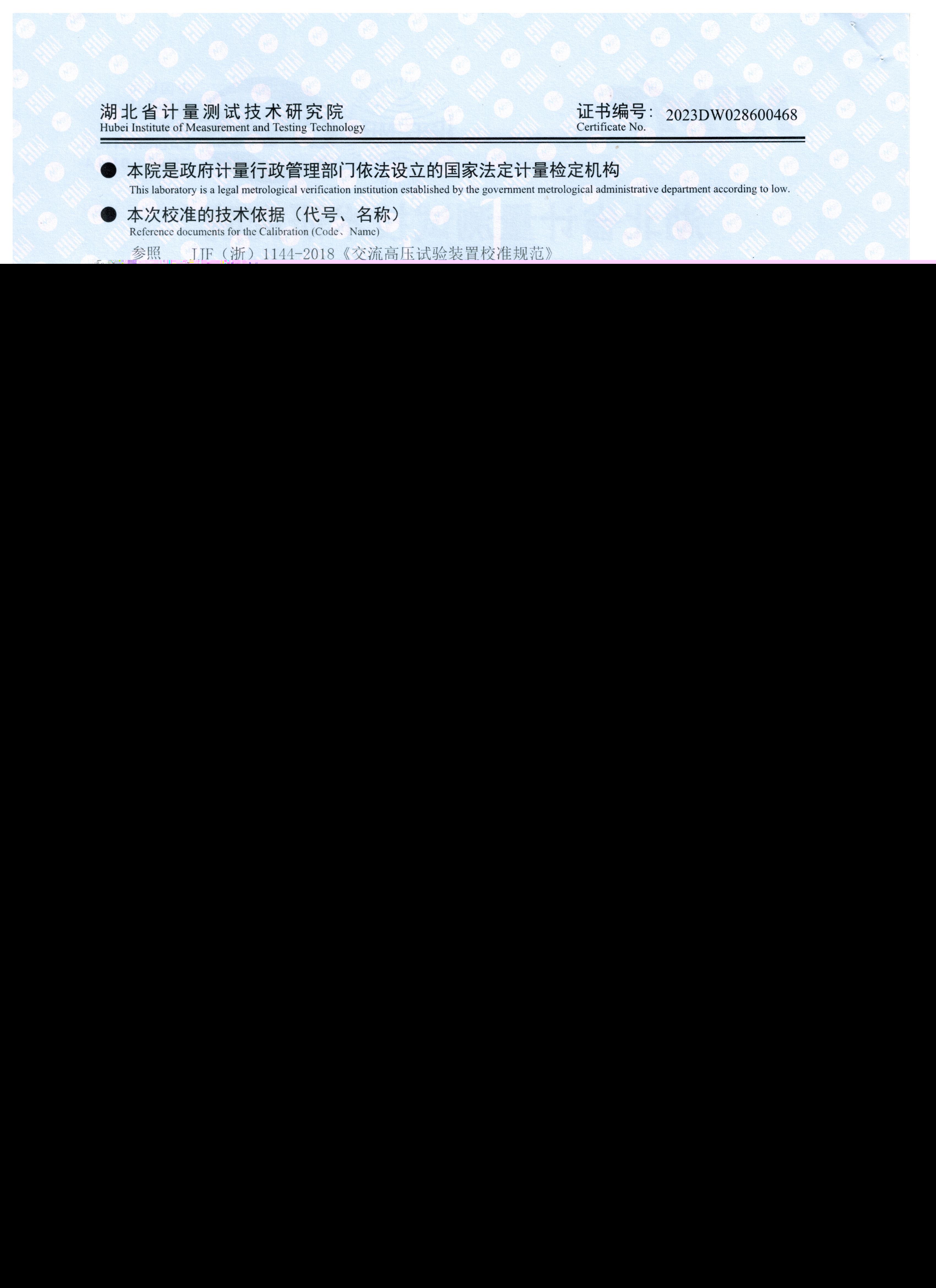 參照 JJG(浙)1144-2018《交流高壓試驗(yàn)裝置校準(zhǔn)規(guī)范》 檢定要求,KDXZ-II-108kVA/108kV 變頻串聯(lián)諧振試驗(yàn)裝置獲得2023DW028600468檢定證書(shū)。