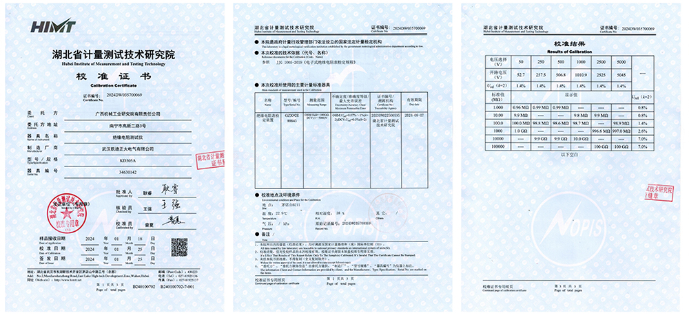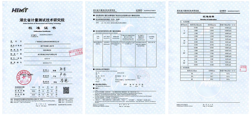 2024年1月25日,廣西機(jī)械工業(yè)研究院有限責(zé)任公司成功采購了凱迪正大電氣的KD305A 絕緣電阻測試儀、KD2575 耐壓測試儀、KD2678 30A接地電阻測試儀、KDGK-F 開關(guān)特性測試儀等電力儀器儀表,均通過權(quán)威的湖北省計量測試技術(shù)研究院的嚴(yán)格校準(zhǔn)。